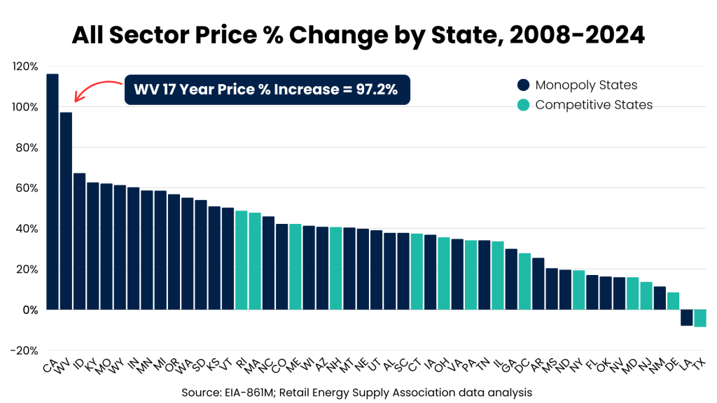 West Virginia continues to rank second worst –– out of all states ––in electricity price percentage change since 2008.