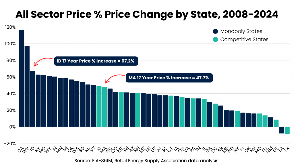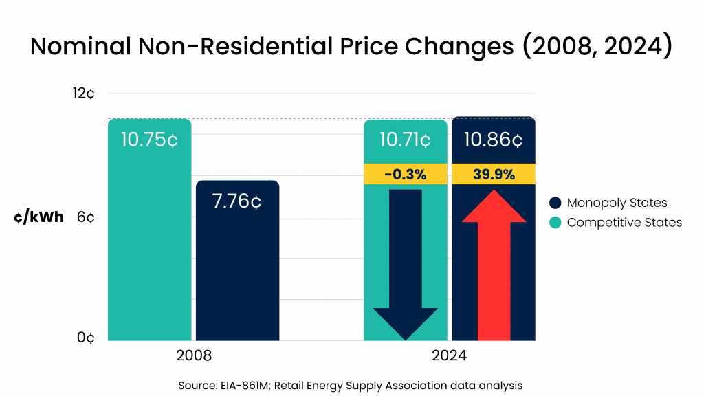 The effect of competition and downward price pressure can be found in all consumer class electricity prices. When comparing all monopoly utility states to competitive states, non-residential (industrial and commercial) electric prices increased by nearly 40% between 2008-2024 in monopoly states. In contrast, electric prices for that same consumer class slightly decreased by .3%.